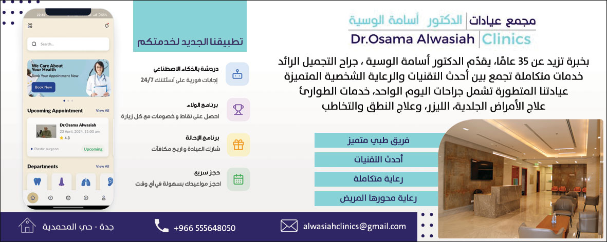 بخبرة تزيد عن 35 عامًا، يقدّم الدكتور أسامة الوسية ، جراح التجميل الرائد خدمات متكاملة تجمع بين أحدث التقنيات والرعاية الشخصية المتميزة عيادتنا المتطورة تشمل جراحات اليوم الواحد، خدمات الطوارئ علاج الأمراض الجلدية، الليزر، وعلاج النطق والتخاطب