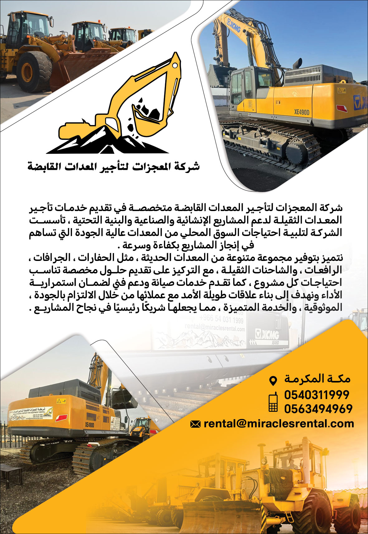 شركة المعجزات لتأجـير المعدات القابضـة متخصصــة في تقديم خدمـات تأجـير المعـدات الثقيلـة لدعم المشاريع الإنشائية والصناعية والبنية التحتية ، تأسســت الشركـة لتلبيـة احتياجات السوق المحلي من المعدات عالية الجودة التي تساهم في إنجاز المشاريع بكفاءة وسرعة .