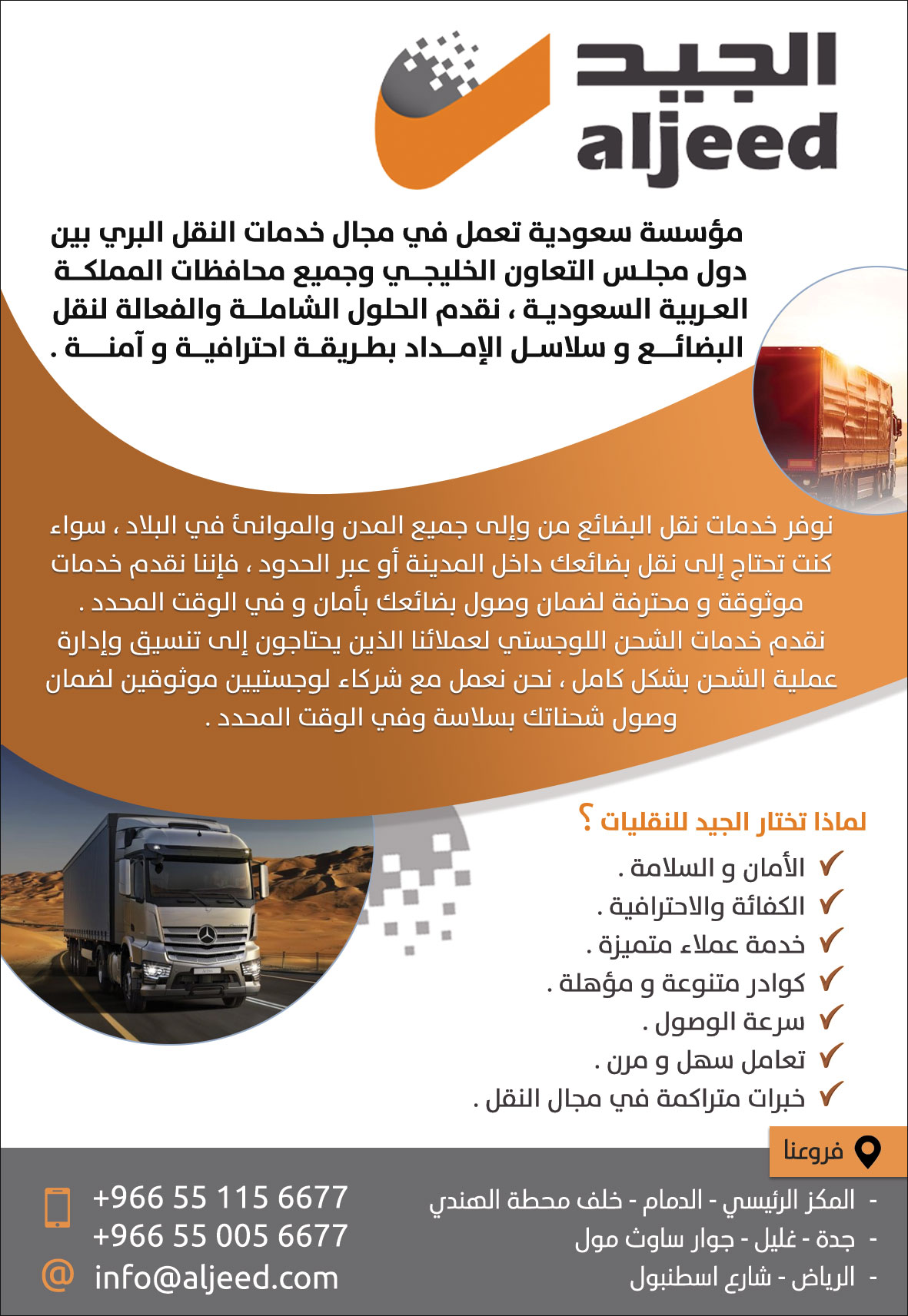 مؤسسة سعودية تعمل في مجال خدمات النقل البري بين دول مجلــس التعاون الخليجــــي وجميع محافظات المملكــــة العــربية السعوديــة ، نقدم الحلول الشاملــــة والفعالة لنقل البضائــــــع و سلاســـل الإمـــــداد بطــريقـــة احترافيــــة و آمنــــــــة .