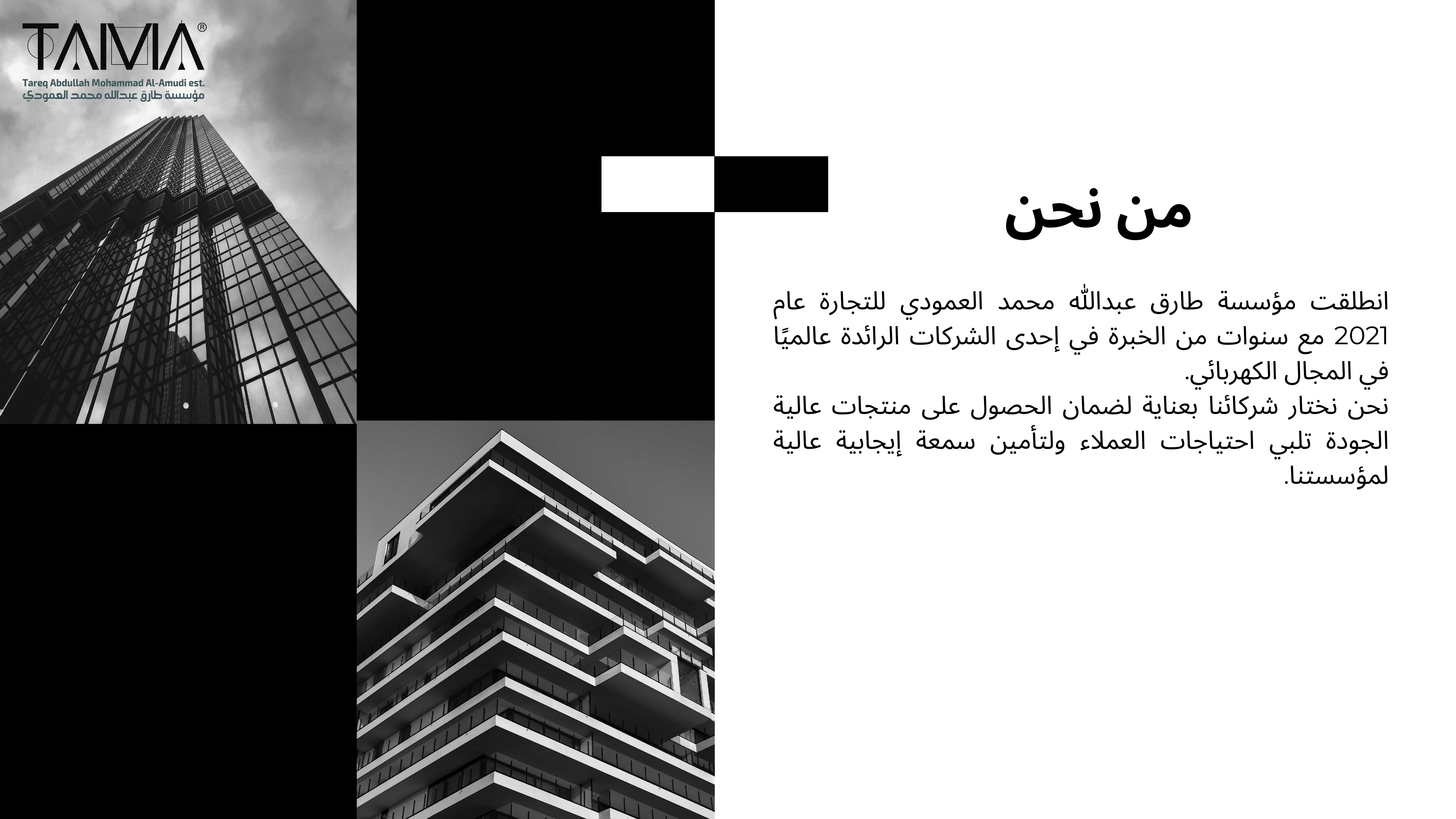 تأسست مؤسسة طارق عبدالله محمد العمودي للتجارة عام 2021 مع سنوات من الخبرة في إحدى الشركات الرائدة عالمًيا في المجال الكهربائي. نحن نختار شركائنا بعناية لضمان الحصول عىل منتجات عالية الجودة تلبي احتياجات العمالء ولتأمين سمعة إيجابية عالية لمؤسستنا