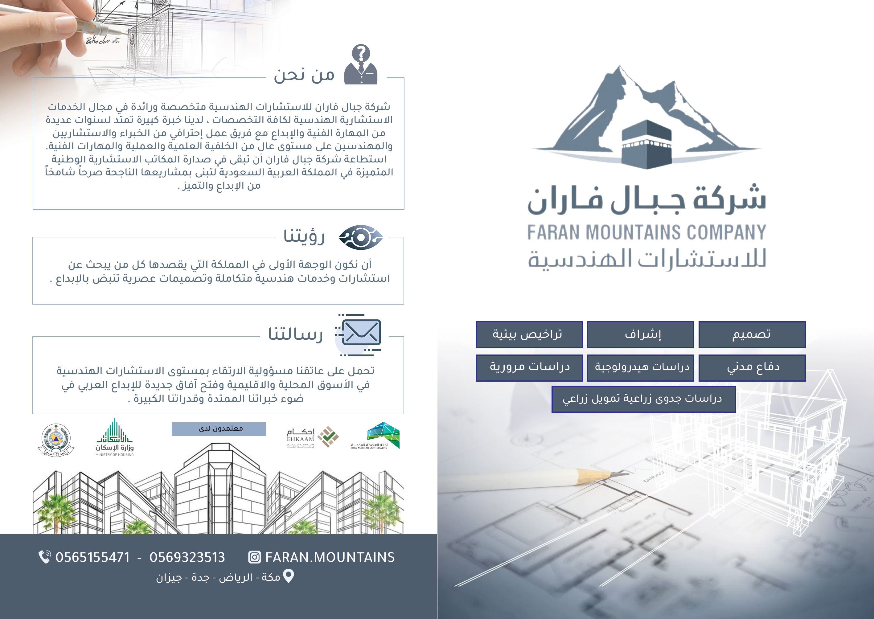 شركة جبال فاران للاستشارات الهندسية متخصصة ورائدة في مجال الخدمات الاستشارية الهندسية لكافة التخصصات ، لدينا خبرة كبيرة تمتد لسنوات عديدة من المهارة الفنية والإبداع مع فريق عمل إحترافي من الخبراء والاستشاريين والمهندسين على مستوى عال من الخلفية العلمية والعملية والمهارات الفنية. استطاعة شركة جبال فاران أن تبقى في صدارة المكاتب الاستشارية الوطنية المتميزة في المملكة العربية السعودية لتبنى بمشاريعها الناجحة صرحاً شامخاً من الإبداع والتميز .