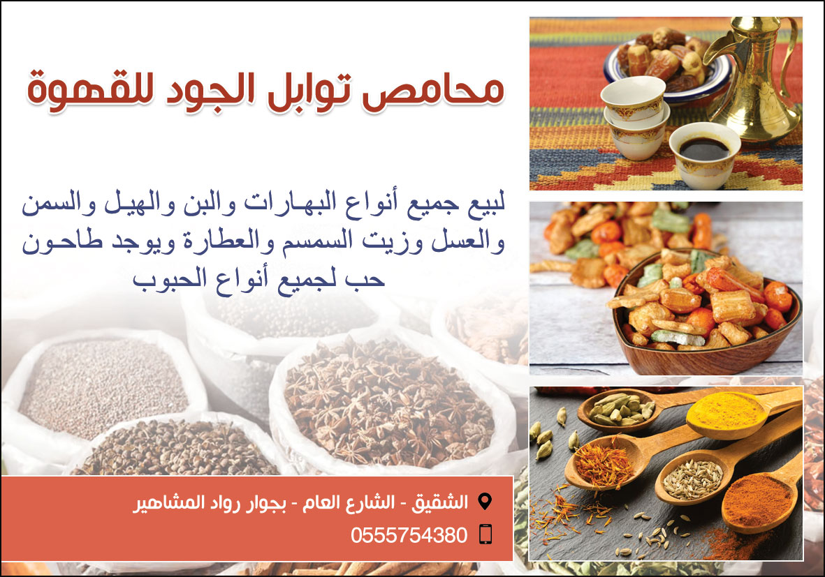لبيع جميع أنواع البهـارات والبن والهيـل والسمن والعسل وزيت السمسم والعطارة ويوجد طاحـون حب لجميع أنواع الحبوب