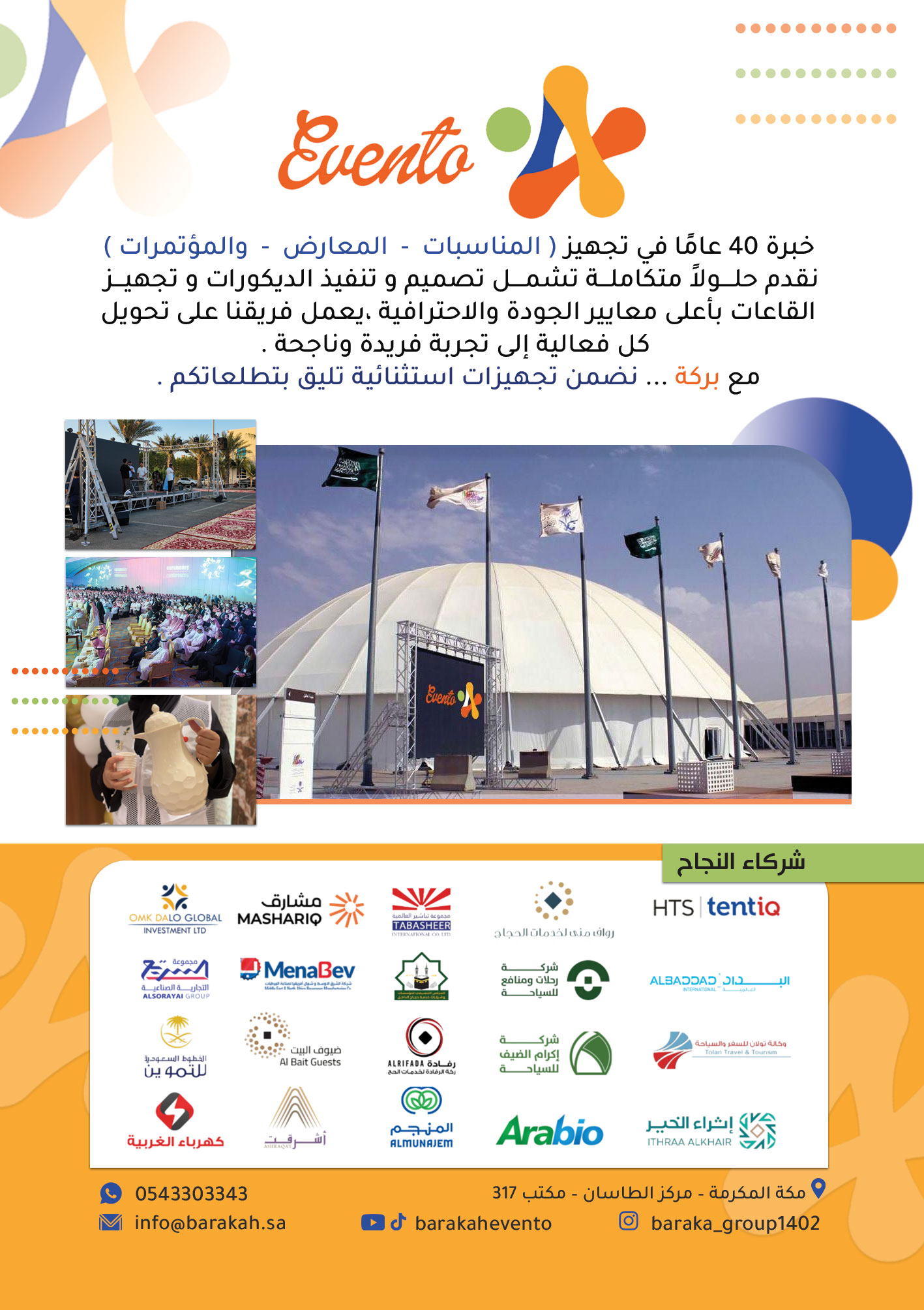 خبرة 40 عامًا في تجهيز ( المناسبات - المعارض - والمؤتمرات ) نقدم حلــــولاً متكاملـــة تشمــــل تصميم و تنفيذ الديكورات و تجهيـــز القاعات بأعلى معايير الجودة والاحترافية ،يعمل فريقنا على تحويل كل فعالية إلى تجربة فريدة وناجحة .